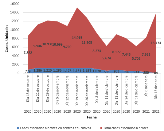La información más reciente emitida por el Gobierno de España-Ministerio de Sanidad nos indica que el número de brotes disminuyó durante el periodo navideño, para aumentar de nuevo durante las primeras semanas de enero de 2021, como podemos ver en la figura 3. No obstante, el aumento de los casos asociados a brotes en centros escolares es una cifra bastante baja que se ha mantenido en descenso desde finales del 2020. A nivel nacional las autoridades informan que el impacto en la actividad educativa es bajo, de manera que, en la última semana de febrero, el 99,4% de las aulas estaban en funcionamiento.