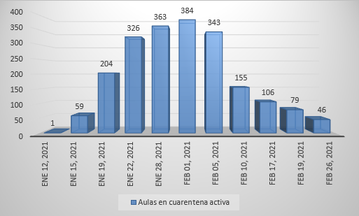 En la figura 4, se puede observar cómo ha ido disminuyendo el número de aulas en cuarentena en Castilla y León, donde el pico más alto del brote se registró a principios de febrero (JCYL, 2021).