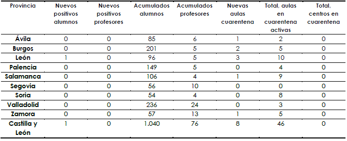 Los datos de la tabla 3, corresponden al día anterior a su publicación, que fue el 26/02/2021. Como centros en cuarentena se computan los centros sostenidos con fondos públicos. El total de aulas en cuarentena activas hace referencia al número de aulas en cuarentena actualmente. En estos momentos han empezado el curso 16.117 aulas en CYL. Se contabilizan los casos positivos detectados por PCR a través de los Equipos covid-Colegios (pruebas realizadas por los servicios de prevención contratados por la Consejería de Educación). En los nuevos casos se contabilizan los casos detectados en el día. Los casos acumulados en la tabla 1 son desde el día 9 de septiembre del 2020, en el que se dio inicio al curso escolar 20-21. Se contabilizan las aulas y centros comunicados en el día del último informe (este corresponde al 26/02/2021). Los espacios educativos afectados lo son bajo los criterios establecidos por la Consejería de Sanidad para el ámbito educativo.