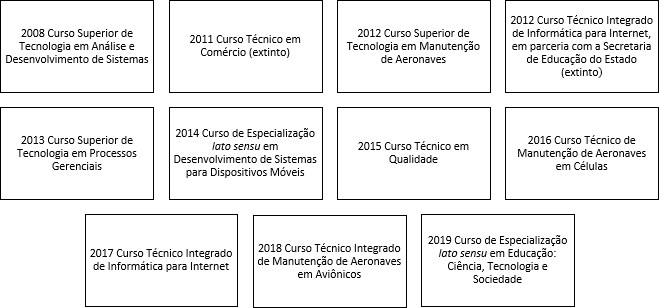 A partir da Portaria n.º 1.008, de 29 de outubro de 2007 (MEC, 2007), foi autorizado o funcionamento do Centro Federal de Educação Tecnológica (CEFET) São Carlos, iniciativa do prefeito Newton Lima, do PT, com vistas a atender demandas do polo aeronáutico no nível tecnológico. O curso que inaugurou o CEFET São Carlos, no entanto, foi o de Tecnologia em Análise e Desenvolvimento de Sistemas, o que acreditamos que tenha ocorrido por burocracias de órgãos, como a Agência Nacional de Aviação Civil. A partir da promulgação da lei 11.892 (Brasil, 2008), com cerca de um semestre de existência, o CEFET São Carlos tornou-se um campus do IFSP. A Figura 1apresenta o histórico de cursos do IFSP São Carlos.