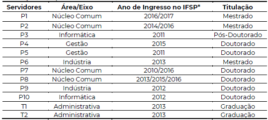 Optamos por um maior número de professores do NC devido às suas experiências pregressas no IFSP, pretéritas ao atual campus de atuação. Esta perspectiva possibilitou um olhar aprimorado desses sujeitos sobre a instituição e maior acurácia no que a diferencia de outros campi. Quanto aos aspectos éticos, submetemos o projeto de pesquisa para a apreciação do Comitê de Ética em Pesquisa em Seres Humanos da UFSCar, aprovado sob o parecer número 2.251.111 em 31 de agosto de 2017, Certificado de Apresentação de Apreciação Ética (CAAE) n.º 72789317.1.0000.5504. Garantiu-se o cuidado com o sigilo dos participantes e foram adotados códigos para identificá-los: utilizamos P1, para o Professor 1; T1 para o Técnico-Administrativo 1; e assim sucessivamente.