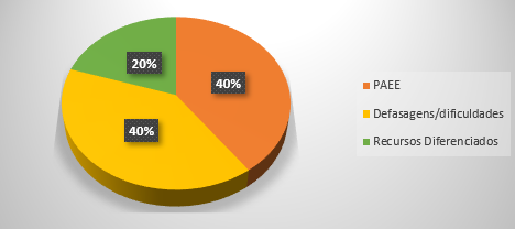 Constatou-se que 40% dos professores apoiam-se no PAEE para encaminhamento do processo de ensino, por eles elaborado, a partir das informações que dispõem sobre o aluno e das fornecidas pelo CRAPE, envolvendo as ações e os recursos necessários ao processo de aprendizagem dos estudantes com TDAH.
