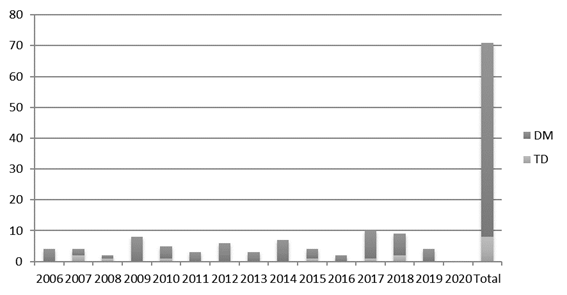 Relativamente às “Concepções de avaliação”, elas são o foco de 21 DM, não sendo identificadas em nenhuma TD. A distribuição destes estudos, por ano, está sistematizada no Quadro 3.