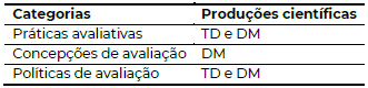 A categoria “Práticas avaliativas” foi aquela que teve maior incidência nos estudos pesquisados. O enfoque nas “Práticas avaliativas” está presente em 7 TD e 36 DM, totalizando 43 produções científicas, como mostra o Quadro 2.