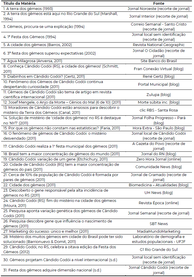 Durante uma visita de campo na comunidade de Cândido Godói, precisamente em agosto de 2018, tivemos acesso a pastas com o acervo de mídias nacionais e internacionais com menção ao nascimento de gêmeos na região. Os recortes textuais de diversas mídias encontravam-se arquivados em pastas nas duas instituições visitadas, ou seja, uma escola estadual e a prefeitura do município. As matérias foram gentilmente cedidas para que pudéssemos fotocopiar ou escanear, colaborando com nossa investigação.