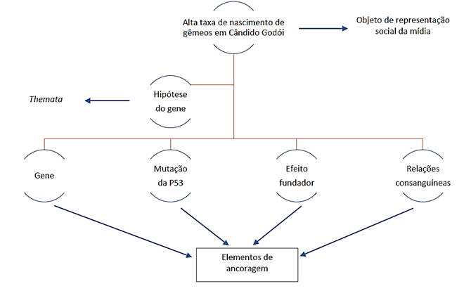Além das modalidades comunicativas como instrumento de análise, assumimos neste estudo o conceito de themata, com o intento de compreender os significados sobre o fenômeno de Cândido Godói representados nos textos midiáticos. Isso porque a ideia de Moscovici (2015) retratada como themata é a de que esta análise poderia nos revelar aspectos da história do conhecimento produzido, da antropologia e do estudo dos significados das palavras, logo a sua denotação. Isso possibilita-nos revelar conteúdos preservados por uma sociedade, indicando possíveis origens do curso de construção de fala(s) e de seu(s) significado(s). Moscovici associa esse sistema de classificação de ideias aos processos de objetivação e ancoragem. Na objetivação observa-se a incorporação de conceitos e na ancoragem ressalta-se a categorização de ideias que se apoiam a uma ideia principal. Quando grupos estabelecem categorias sobre um objeto de representação social, constroem também US. Logo, para a determinação de themata foram identificadas no corpo dos textos analisados as inferências sobre o fenômeno de nascimento de gêmeos na região. Quanto à explicação de porquê nascem tantos gêmeos, foram identificadas as hipóteses descritas a seguir: