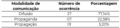 Como podemos observar na Tabela 1, a modalidade de comunicação com maior ocorrência foi a difusão, com 77,14% de representatividade. Estes resultados podem ser comparados em estudos que classificam como difusão a maioria das matérias (Castro & Gomes, 2008), uma vez que têm como características fundamentais informar de maneira generalista o grande público, bem como expor opiniões. Faz todo sentido o predomínio da modalidade difusão, uma vez que os textos tratam da divulgação do conhecimento científico sobre o fenômeno da alta taxa de gêmeos em Cândido Godói. Em seguida, e em ordem decrescente, aparecem a propaganda e a propagação. É importante salientar que em certos textos midiáticos foi identificado mais de uma função para a mensagem, no sentido de informar e influenciar condutas. Neste caso, o mesmo texto é classificado em mais de uma modalidade comunicativa.