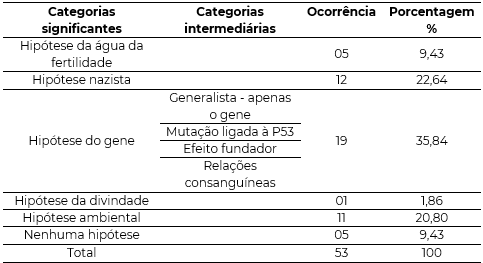 Em um mesmo texto pode-se observar a menção de mais de uma hipótese. De maneira geral, observou-se que as mídias analisadas refutaram a hipótese nazista a partir da divulgação de estudos e dados obtidos pela ciência. Na Tabela 2 podemos observar a frequência das categorias significantes elencadas em nossa investigação, assim como o padrão de ocorrência.