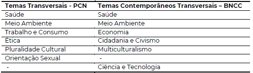 […] diferentemente dos PCNs, em que os Temas Transversais não eram tidos como obrigatórios, na BNCC eles passaram a ser uma referência nacional obrigatória para a elaboração ou adequação dos currículos e propostas pedagógicas, ampliados como Temas Contemporâneos Transversais, pois, conforme a BNCC (BRASIL, 2017), são considerados como um conjunto de aprendizagens essenciais e indispensáveis a que todos os estudantes, crianças, jovens e adultos têm direito. (Brasil, 2019a, p. 11)