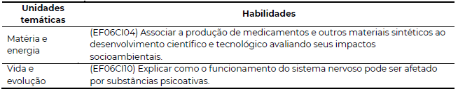 A BNCC e seus TCT praticamente excluem o tema álcool e outras drogas. Exceção única aparece no componente curricular Ciências para o 6º ano, conforme se vê no Quadro 2: