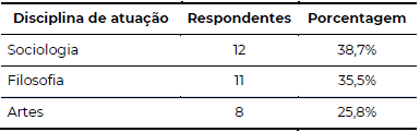 Um elemento importante evidenciado na caracterização dos sujeitos da pesquisa é que a totalidade dos professores possui Licenciatura na disciplina em que está atuando, o que exemplifica a relevância do curso para a respectiva docência. No cenário da Filosofia e da Sociologia, quando do seu retorno à grade curricular, constataram-se, inicialmente, poucos professores habilitados para atuar na disciplina, assim, diante de tal cenário, verifica-se melhora do quadro no âmbito da formação na própria disciplina. Por um lado, é notório que os docentes atuam nas áreas de sua formação específica, sendo um aspecto positivo da educação no Paraná; por outro lado, a redução drástica da disciplina de Artes/Filosofia/Sociologia desmotiva os docentes no seu processo de desenvolvimento profissional.