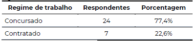 Quanto ao regime de trabalho, prevaleceu o vínculo de concursado, como mostra a Tabela 2.