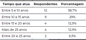 O tempo que atua como professor foi outro elemento questionado aos professores respondentes. Nenhum docente afirmou período inferior a cinco anos; os demais, em ordem decrescente de respondentes, afirmaram do modo como mostra a Tabela 3.