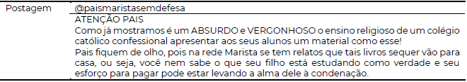 Mais uma vez o livro, através dos símbolos e rituais, procura igualar as religiões e até seitas pagãs, o que certamente confunde a criança que está no início de sua formação religiosa. Tudo isso para um colégio confessional CATÓLICO e aí pais vocês sabiam disso? Olharam os livros de seus filhos? Acompanharam de perto?” (Pais Maristas em Defesa do Ensino Religioso, 2020d, s.p.)