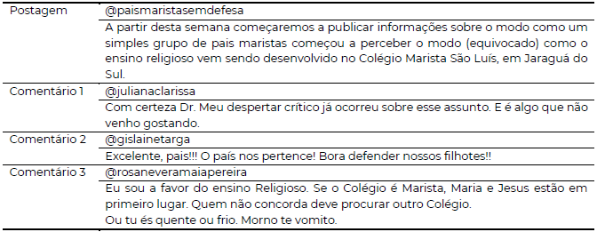 A recepção da iniciativa por parte de outros pais pode ser observada nos comentários da publicação. No comentário 2, a usuária atribui a defesa do ensino religioso à defesa cívica do país, conferindo pela primeira vez caráter político à página ao escrever: “O país nos pertence! Bora defender nossos filhotes!”. Isso sugere que, para ela, a adoção dessa abordagem do ensino religioso está permeada pela representação de um ideário político. Já no comentário 3, a usuária ressalta que se o colégio é Marista, Maria e Jesus devem estar em primeiro lugar e quem não concorda com tal afirmação deve procurar outro colégio. Outro indício do forte sentimento de pertença desses pais em relação ao colégio e à postura de pouca receptividade à diversidade religiosa presente no cerne da tensão por parte de algumas famílias.
