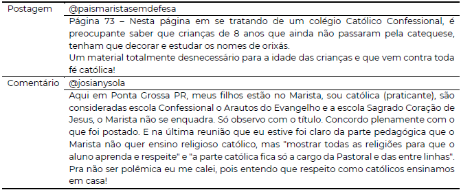 Essa resistência ganha ênfase quando se trata da equiparação que o material apresenta entre as religiões de matriz africana e o cristianismo. Observamos no Quadro 3 esse questionamento, quando a indignação se dá pelo fato de que o nome e a natureza dos Orixás são abordados no capítulo do livro que apresenta o Candomblé. Segundo o administrador da página: “É preocupante saber que crianças de 8 anos que ainda não passaram pela catequese, tenham que decorar e estudar os nomes dos orixás” (Pais Maristas em Defesa do Ensino Religioso, 2019c, s.p.).