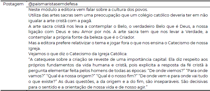 Nesta outra postagem publicada em 2 de novembro de 2019 (Quadro 4), a indignação se dá pelo fato de o material apresentar obras de arte que expressam a relação do ser humano com outras tradições religiosas. Na publicação deixam claro a posição de intolerância em relação a outras denominações religiosas que pode ser observada com maior ênfase em alguns trechos, por exemplo, ao se afirmar que somente a “arte sacra cristã nos leva a contemplar o verdadeiro Belo que é Deus”, ao denominar as outras expressões artísticas não cristãs como “arte pagã”, e ao se afirmar que a “editora prefere relativizar o tema e jogar fora o que nos ensina o Catecismo de nossa Igreja” (Pais Maristas em Defesa do Ensino Religioso, 2019d, s.p.).