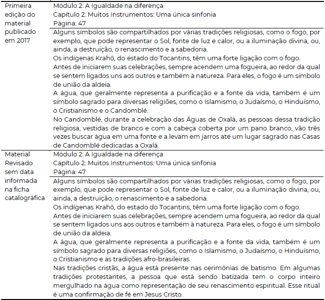 Em nova análise do material didático para Ensino Religioso do Sistema Marista de Educação publicado pela editora FTD, observamos que o material foi submetido a um processo de revisão e, embora a inscrição “material revisado” apareça sutilmente descrita na capa do material, a ficha catalográfica não indica o ano em que a revisão foi realizada. A partir da análise de conteúdo da edição revisada com enfoque nas páginas alvo do questionamento das famílias, foi possível observar que a abordagem fenomenológica, bem como a estrutura a partir dos módulos e capítulos subsequentes foram preservadas na nova edição, mas com uma sutil alteração no conteúdo. Em alguns trechos observamos que as palavras Umbanda e Candomblé são substituídas por tradições afro-brasileiras. Em outros trechos pode se notar a substituição dessas referências por outras tradições religiosas não africanas. No quadro abaixo se apresenta um exemplo de como essas alterações foram realizadas ao se comparar o mesmo conteúdo em edições distintas do material. Trata-se de um trecho extraído do quarto volume da coleção Ensino Religioso, do capítulo 2, “Muitos Instrumentos: Uma única sinfonia”.