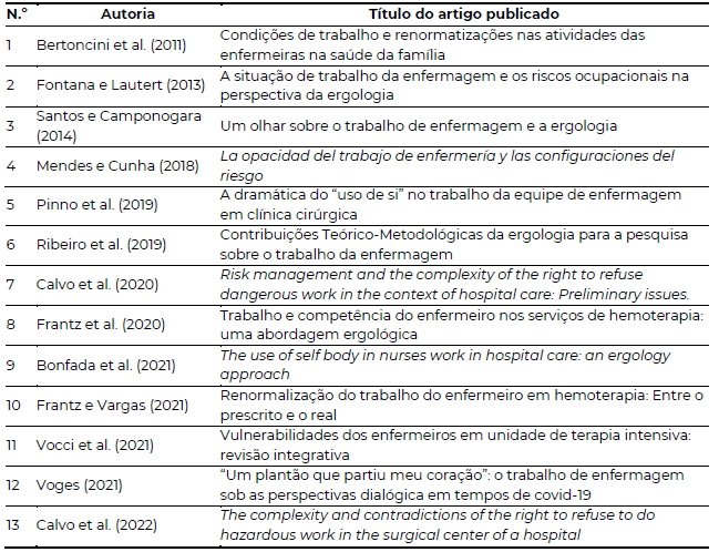 Tendo em vista o método de pesquisa aqui citado, pontua-se que a partir dos 13 periódicos encontrados, pode-se primeiramente separá-los e organizá-los por: nome dos autores, o ano de publicação a fim de melhor expressar e compreender os diversos temas que a ergologia e a enfermagem têm abordado (Quadro 1).