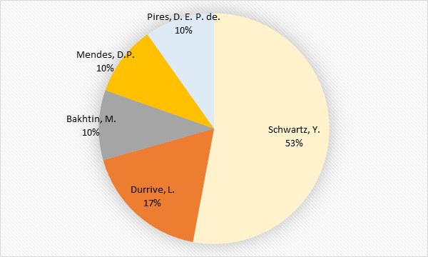 A referência bibliográfica mais utilizada foi do autor Yves Schwartz, com 53% de citações, seguido de Louis Durrive com 17%. Demais autores citados nas pesquisas e não menos importantes, que abrangeram 17% e 10% do total de estudos, demonstrando, assim, que a nova geração está ganhando espaço nas pesquisas científicas relacionadas à ergologia do trabalho e, portanto, sendo colocados como pesquisadores confiáveis sobre o assunto.