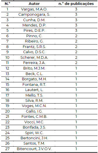 A partir do detalhamento das possibilidades que o estudo bibliométrico permite, foram quantificados 27 autores que se propuseram trabalhar e publicar os resultados e análises de suas pesquisas em aderência com a temática Enfermagem, como também, verificar que alguns destes, trabalharam em mais de um periódico, como é possível ser visualizado na Tabela 1.