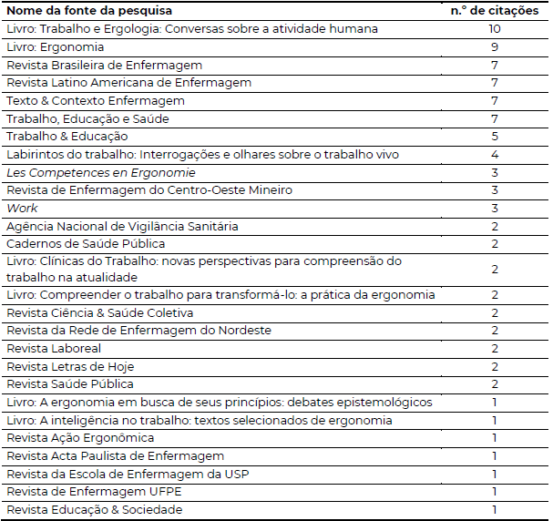 Entretanto, existem outras fontes de pesquisas que foram citadas uma única vez, não cabendo colocar todas, devido ao quantitativo de material estudado. Desta forma, é visto que existem trabalhos brasileiros postados em periódicos nacionais e internacionais relacionando à ergologia e à enfermagem no meio científico e à preocupação dos pesquisadores sobre o assunto (Tabela 2).