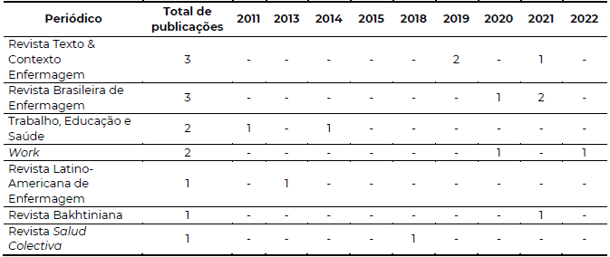 Quanto aos resultados sobre revistas publicadas, a Revista Texto & Contextos Enfermagem foi a escolhida pelos autores para a publicação dos seus resultados sobre enfermagem e ergologia, correspondendo a 23%, o que equivale a três publicações. A mesma pontuação recebeu a Revista Brasileira de Enfermagem (23% do total de trabalhos, o que equivale a três periódicos publicados). Logo, as Revistas Trabalho, Educação e Saúde e a Work tiveram 15%, consolidando duas publicações cada, nas bases de dados. Demais Revistas contemplaram 8%. A tabela abaixo apresenta a distribuição, por periódicos, do número de artigos sobre o tema publicados a cada ano (Tabela 3).