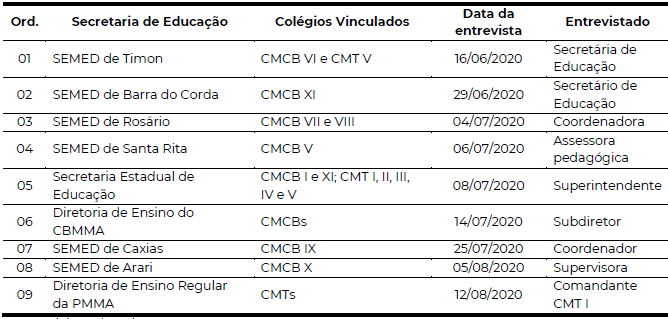 Observa-se que CMCB I (São Luís), CMT I (São Luís), CMT II (Imperatriz), CMT III (Bacabal), CMT IV (Caxias) e CMT V (Timon) são da SEDUC. As demais unidades estão em municípios distintos, envolvendo sete Redes Municipais de Educação, pois uma delas conta com dois colégios cada (Rosário). Destaca-se que o CMCB XI (Barra do Corda) é uma escola que faz parte da rede estadual de educação e também da rede municipal. Acrescentou-se, também, duas entrevistas, uma com a Diretoria de Ensino do CBMMA e uma com a Diretoria de Ensino Regular da PMMA, acreditando ser importante ouvir os gestores desses dois setores sobre a temática em estudo, prevendo ao todo nove entrevistas.