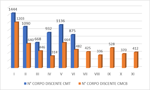 Dos dados fornecidos pelas escolas militarizadas do Maranhão e da análise dos documentos, chega-se ao Gráfico 1 relacionado a seguir, em que destaca-se o número de alunos matriculados pelos CMCBs e CMTs em 2020, indicando que o CMT I e CMCB I possui um público maior de alunos que abrange tanto estudantes do ensino fundamental como do ensino médio.