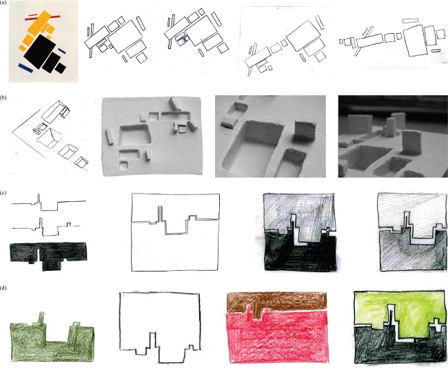 - “Imaginem que esta composição é uma planta onde um indivíduo tem esta escala. Que cenário poderia ser? Sentiam-se bem aqui? Poderia ser um espaço de recreio? Poderiam dançar aqui? Ou um espaço intimista, labiríntico que fomentasse medo e desconfiança? E se aumentassem a escala e um indivíduo fosse deste tamanho? E se fosse um objecto? Para quê e como funcionaria? E se fosse uma secção? Imaginem, agora, que esta outra composição representa uma secção e aqui se realizam festas? Quem levariam para vos acompanhar a esta festa? Que cores e texturas parece suscitar este espaço? Ou que cores e texturas poriam, se quisessem que o evento fosse muito formal? Ou informal? E a que soa? E a que cheira? Faz frio? etc.