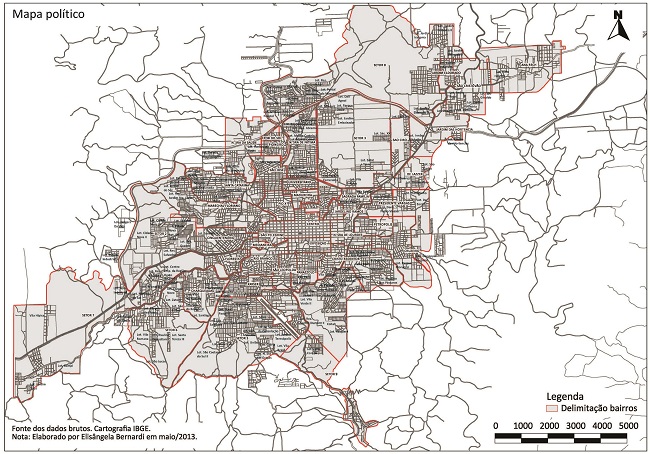 Para a proposta neste estudo, foi realizado outro agrupamento dos atributos, com a finalidade de elaborar sínteses através de mapas temáticos. Consideraram-se os grupos cujos atributos tiveram maior indicação pelos autores estudados (Grupos 1, 2, 3, 6 e 9) e os grupos com mais atributos identificados nos estudos de caso (Grupos 6, 7, 8 e 10). Desta forma, a “Compactação” foi analisada através de mapas temáticos de uso do solo e altura das edificações, “Conectividade” foi verificada através da disponibilidade de transporte público e da topografia, e “Relação com a natureza” foi identificada nos mapas com as localizações de parques e praças. Para a análise foram escolhidos os seguintes itens para mapeamento: espaços abertos, escolaridade, domicílios, transporte público, população e renda. Os dados foram retirados de três fontes: IBGE, Prefeitura de Caxias do Sul e Visate (empresa responsável pelo transporte público na cidade). Como base para o mapeamento dos dados, foi utilizado o mapa político mostrado na Figura 1.