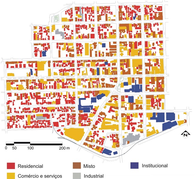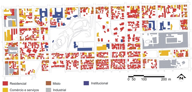 Para se verificar o atributo de sustentabilidade urbana referente à compactação, fez-se necessária a elaboração de um mapa de uso do solo (Figura 7) e um mapa da altura das edificações (Figura 8). O atributo de compactação refere-se ao indicador de densidade.