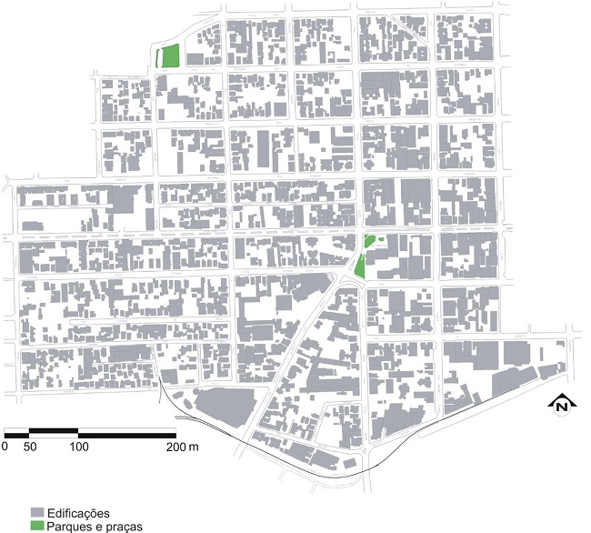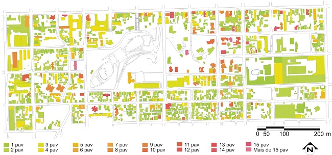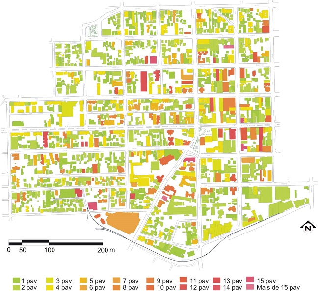 Através da elaboração de mapas de uso do solo (Figura 2) e da altura das edificações (Figura 3), pode-se verificar o atributo de sustentabilidade urbana referente à compactação.