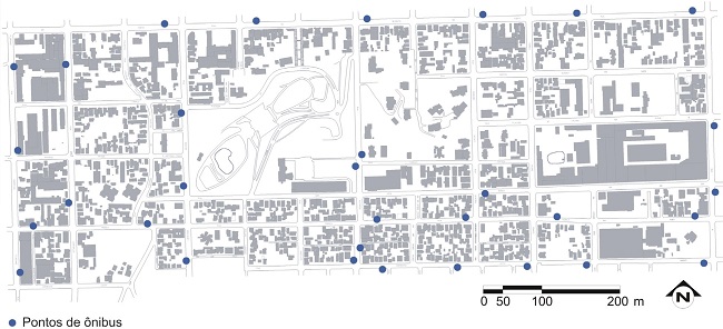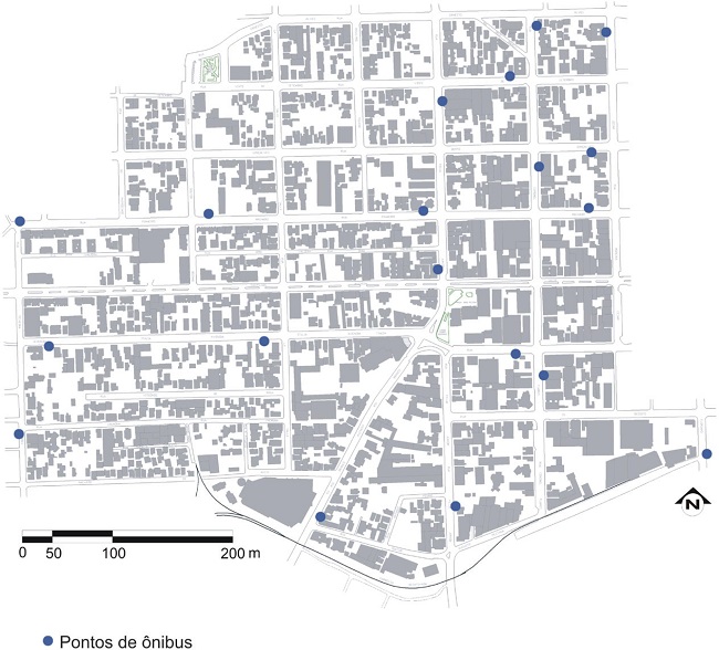 No que diz respeito ao atributo da conectividade, seu respectivo indicador é o transporte público e as barreiras topográficas; estes dois indicadores deram origem ao mapa de pontos de ônibus (Figura 9) e ao mapa da topografia (Figura 10).
