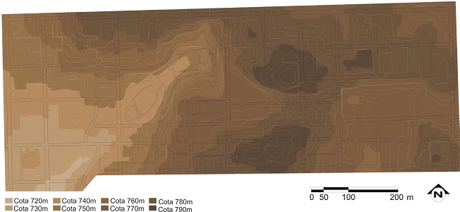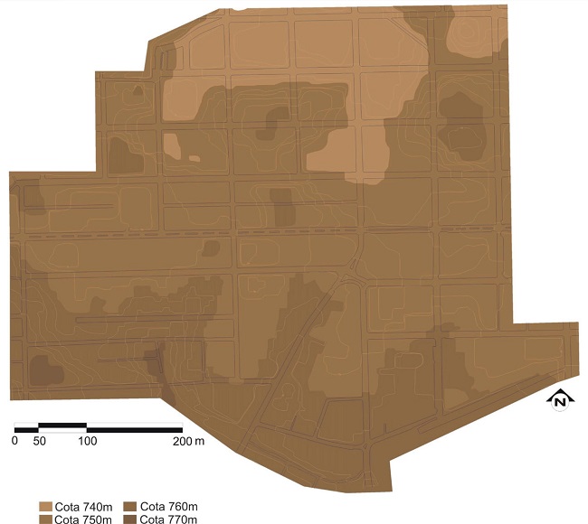 Em relação ao atributo de conectividade, cujo indicador é o transporte público, foi elaborado o mapa de pontos de ônibus do bairro a fim de se verificar sua mobilidade (Figura 4). Esta mobilidade depende também dos desníveis topográficos apresentados no mapa da topografia do bairro (Figura 5). A topografia no mapa está representada numa escala de cores que representa desníveis de 10 m em 10 m, para que se possa verificar onde estão as maiores barreiras topográficas que acabam por impedir deslocamentos muito longos a pé ou de bicicleta.