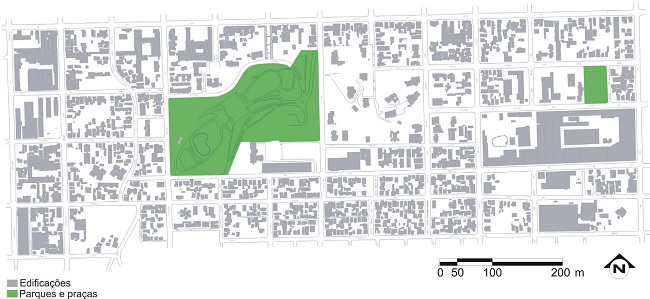 Por fim, para se verificar o atributo da relação com a natureza, que corresponde ao indicador de sustentabilidade urbana da localização de parques e praças, fez-se necessária a elaboração do mapa destas áreas (Figura 11).