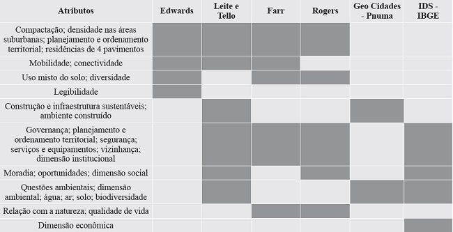 Em relação ao Grupo 1, alguns de seus atributos são citados por Edwards (2008), Farr (2008) e Rogers e Gumuchdjian (2001). Conforme Edwards (2008), para um desenvolvimento sustentável urbano, os princípios são a compactação, maiores densidades nas áreas suburbanas e residências de quatro pavimentos. Para Farr (2008), a compactação é necessária para gerar densidades e concentrações de usos para racionalização e integração de redes de infraestrutura. Segundo Rogers e Gumuchdjian (2001), o modelo de cidade autossustentável é o modelo de cidade densa.