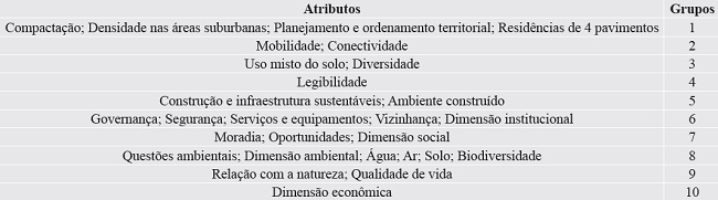Levantou-se um total de 28 atributos citados pelos autores; com isso, foi feito um agrupamento levando em consideração sua natureza e proximidade de assunto. Deste agrupamento resultaram 10 grupos contendo cada um deles um ou mais atributos (Quadro 2).