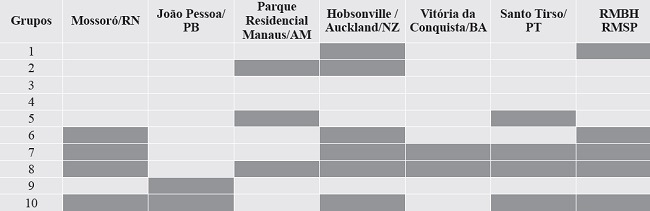 Foi elaborada uma segunda matriz de análise (Quadro 3) confrontando os dez grupos criados – conjunto de atributos – e oito estudos de caso, para que se verificasse o cruzamento de dados a fim de observar que conjunto de atributos são mencionados em cada estudo de caso. Os casos foram selecionados com base na disponibilidade de informações sobre as metodologias dos estudos.