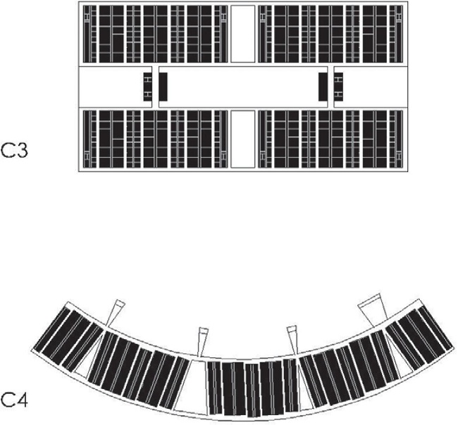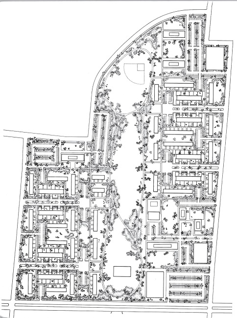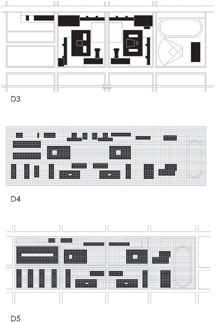 En la versión final del proyecto en cambio, la morfología de los edificios se vuelve más uniforme; son todos paralelepípedos puros (excepto el gimnasio y piscina, que presenta alguna irregularidad). En ellos el uso interno viene explicitado casi exclusivamente por las dimensiones de la crujía estructural, y la aparición de patios, por necesidades de organización interna o iluminación. Además se puede apreciar una característica que no aparecía en la anterior versión: la modulación estructural es común a todos los edificios del campus y supone el establecimiento de un sistema de orden abstracto para todo el conjunto. Es una característica que liga el proyecto a los conjuntos de carácter más compacto, que necesariamente deben establecer una modulación común a todas sus partes, pero que, en cambio, creemos se encuadra más directamente en la línea evolutiva del campus disperso.