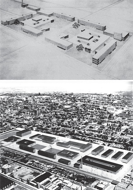 En la línea evolutiva del campus disperso, se va a producir a su vez una contaminación de gran interés y relevancia para el desarrollo de la arquitectura moderna en Estados Unidos. Nos referimos al proyecto del campus de Instituto Tecnológico de Illinois de Mies van der Rohe y Ludwig Hilberseimer. Si tenemos en cuenta dos de las versiones existentes para la ordenación del campus del IIT, que están documentadas en dos planos de los años 1938-39 y de 1942, respectivamente, se puede observar un notable cambio de orientación del proyecto.