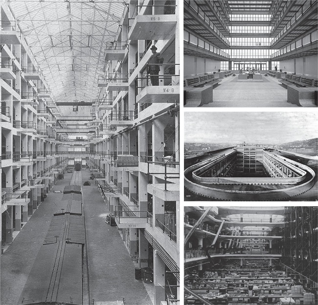 La fábrica de Boots (que acababa de pasar a manos de una empresa americana) se basa en un proceso por gravedad. Las materias primas se elevaban hasta la última planta y se deslizaban hasta la baja, donde se empaquetaban en un proceso lineal mecanizado a lo largo de la planta. El parecido con los procesos de Highland Park New Shop es total, y los patios interiores cubiertos de 5 alturas que lo hacían posible remiten claramente al de la fábrica de Detroit8 . Este atrio interior cubierto de varias plantas es casi un invariante en este tipo de organizaciones compactas: aparece en Highland Park New shop, en la fábrica Boots; en la Lingotto está descubierto y en otros edificios como los laboratorios Bell de Saarinen aparece, pero sin tener ya justificación dentro del proceso productivo.