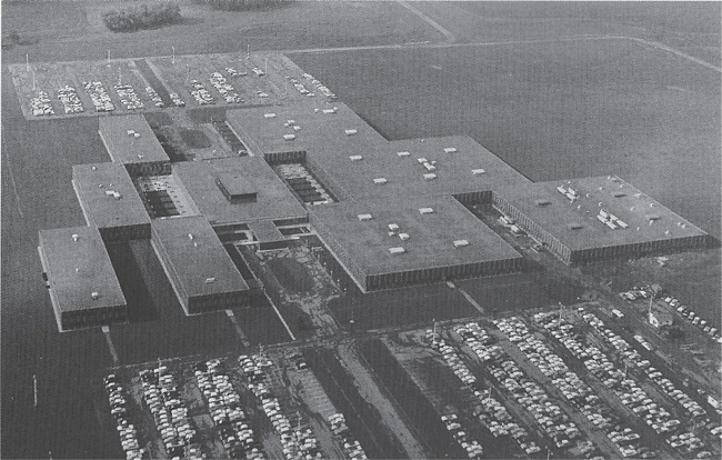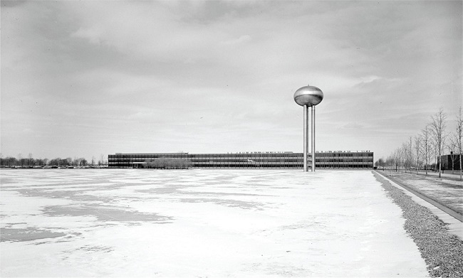 Las distintas piezas se disponen aproximadamente en damero deslizando sobre unos ejes asociados a las fachadas en los que se encuentran las circulaciones. Todo el conjunto es de similar altura a pesar de que las piezas de oficinas tienen dos plantas y las de producción sólo una. La expresión de la modulación exterior en la fachada producía la imagen del edificio. Como en la General Motors, Saarinen utiliza perfiles verticales “miesianos”, en este caso de aluminio, para traslucir este orden. Estas tensas membranas, iguales al exterior que en los patios internos, ocultan los cantos estructurales de piso intermedio, basamento y cubierta, lo que produce un edificio de aspecto abstracto, sereno y monolítico en el que se integran la modularidad y unidad formal de Mies en el IIT y la compacidad total del conjunto de Highland Park.