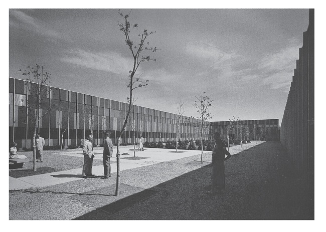 Más importante y fructífera nos parece la otra deriva paralela, la que nos conduce desde River Rouge al campus del IIT y llega hasta el General Motors Technical Center de Detroit. La influencia de Albert Kahn en este proyecto es doble. Por una parte, viene implícita en la enorme influencia que el campus para el IIT supuso para Saarinen9, no sólo en la distribución final de piezas, que se parece notablemente a las primeras versiones de Mies para su campus de Chicago, sino también en el uso de unos muros cortina en fachada que recuerdan a los edificios en altura miesianos10.