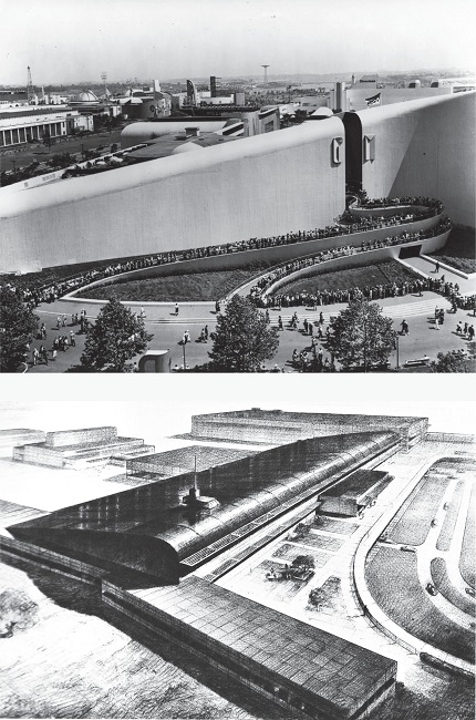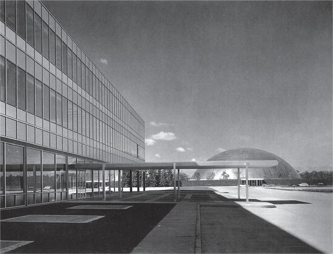 Y, por otra parte, por la relación que Eero Saarinen y su padre Eliel, residentes en Detroit desde su llegada a Estados Unidos, tuvieron con el arquitecto de Ford. Eliel y Kahn habían trabajado ambos en edificios del campus de Cranbrook, cercano a Detroit, y tenían una relación profesional y personal. Kahn era el arquitecto de muchos de los edificios industriales e institucionales de General Motors construidos con anterioridad, incluyendo la sede central en Detroit, de 1919, que fue el mayor edificio de oficinas de su época, y el Pabellón de General Motors de las Exposiciones Universales de 1933, en Chicago, y 1939, en Nueva York, este último proyectado junto con el diseñador Bel Geddes. Eero Saarinen colaboró además en el proyecto interior de Bel Geddes para este edificio, “Futurama”, un enorme diorama que anticipaba el futuro cercano (la fecha hipotética de esta prospectiva arquitectónica era 1960) de la urbanización en Norte América basada en el uso extensivo del coche, en la automatización del transporte rodado y en la desurbanización, en lo que podemos denominar junto con las propuestas de Hilberseimer como el urbanismo fordista.