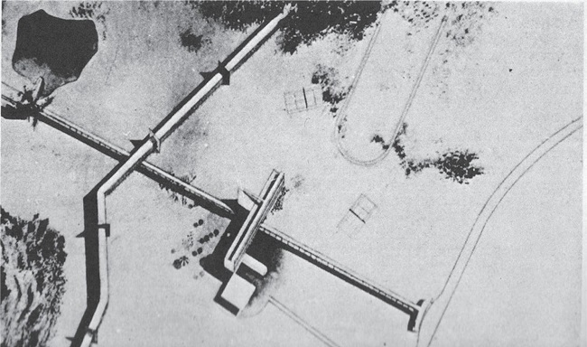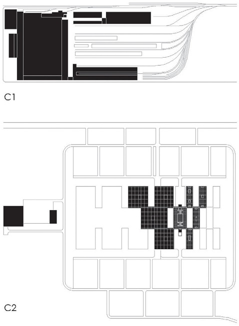 También la estrategia proyectual es coincidente en ambos casos, acercándose en sus planteamientos a la utilizada en el diseño de un objeto técnico puro. El diseño de ambos organismos se basa casi exclusivamente en criterios inherentes a su propio funcionamiento, convirtiendo los condicionantes externos a éste en accesorios o inexistentes para el proyecto. La estrategia de implantación, que en ambos casos aprovecha la presencia de un río navegable, no es arquitectónica, no contempla el lugar y el paisaje como contexto, ni atiende a condicionantes culturales, orográficos, ni climáticos de ningún tipo. El contexto se convierte en un nuevo “medio asociado”16, híbrido en su carácter técnico y geográfico, en el que sólo aparece la dirección principal de los vientos dominantes, respondiendo a la necesidad técnica de evitar que los humos industriales contaminen el resto de la ciudad.