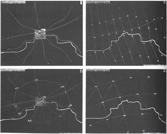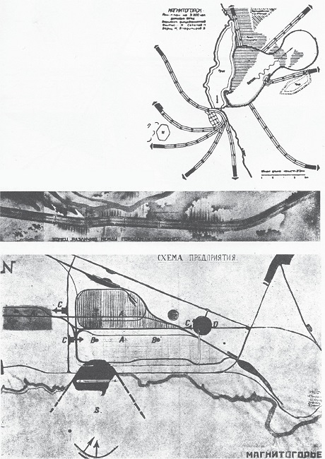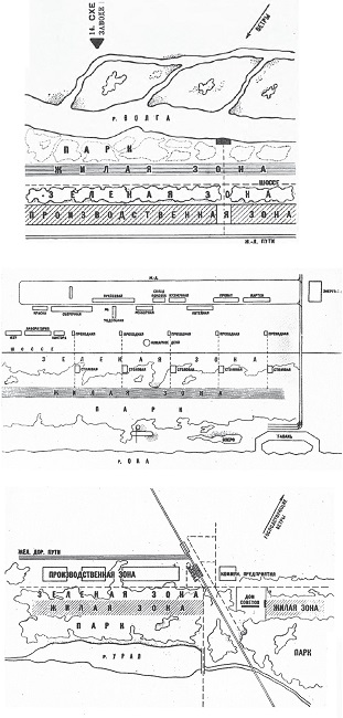 Tanto en la Ciudad-fábrica como en la Fábrica-ciudad, la planta, como elemento que pormenoriza la actividad humana, desaparece, dejando paso al esquema de flujos, que articula la estructura del conjunto desde una óptica simplificada y “científica” de la que se ha eliminado toda la complejidad e imprevisibilidad derivada del comportamiento individual. Los urbanistas soviéticos traducen así las fábricas de Kahn en unas propuestas para las nuevas ciudades socialistas, siempre asociadas a centros de producción industrial, que replican morfológicamente los complejos del arquitecto de Detroit. En el caso del Sotsgorod de Miliutin, toda la ciudad pasa a funcionar como una fábrica fordista que, con una organización lineal en bandas, exige una mecanización de todos los aspectos de la vida humana, y que derivará en un nuevo modo de vida colectivizado soviético y en la abolición de la separación de la ciudad y el campo preconizada por los “libros sagrados” soviéticos como el Anti-Düring de Engels18 (1968, p. 230).