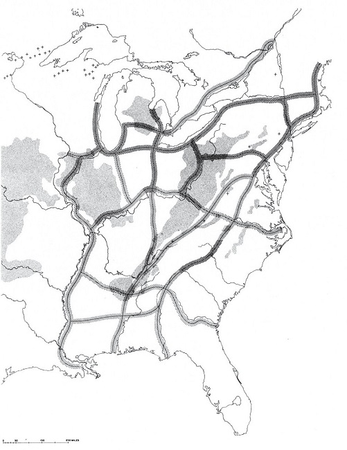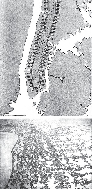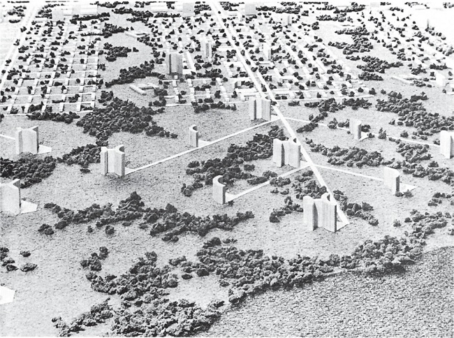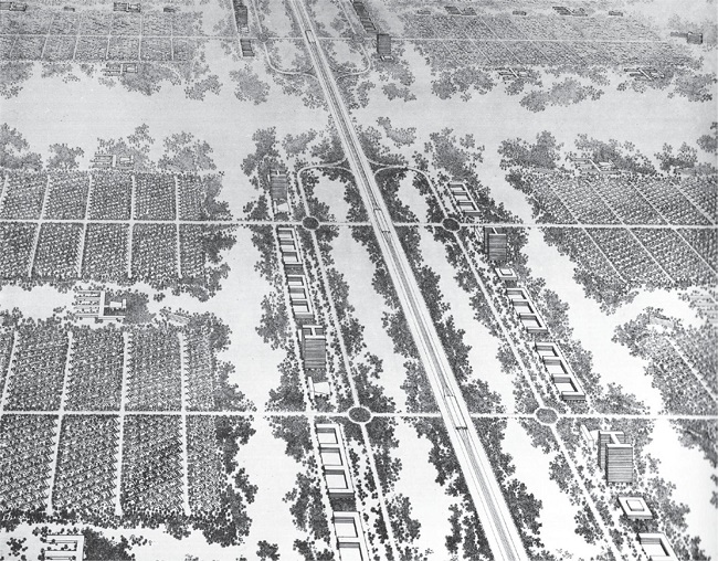 La propuesta de Hilberseimer para los planes regionales se basaba en la infraestructura de nuevas autopistas interestatales que estaba llevando a cabo el gobierno americano20 . Hilberseimer plantea, como los desurbanistas rusos, la disolución de la diferencia entre ciudad y campo, aunque utiliza distintas fuentes: en vez de Engels cita a Ford diciendo: