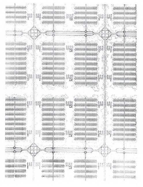 Estas convergencias en el plano conceptual y en el estratégico-proyectual producen una coincidencia morfológica entre ambos sistemas. El Sotsgorod de Miliutin toma así el aspecto de un “río mecánico”, de una inmensa línea de montaje susceptible de crecimiento lineal infinito. En ambas, todo está pensado para no interrumpir la fluidez de la línea: las circulaciones transversales se producen siempre a distinto nivel, no hay cruces17 . Todos los componentes de la ciudad-fábrica están estrictamente separados, no hay usos solapados en el tiempo, los habitantes funcionan también como un fluido viscoso que se desplaza en masa de una zona de usos a otra de forma sincrónica. La modularidad y prefabricación de los elementos, derivados de la experiencia de Kahn, es total. Estas partes están netamente distanciadas para permitir la máxima flexibilidad en su crecimiento y modificación, y tienen la voluntad de funcionar como verdaderos objetos técnicos destinados a cumplir un solo cometido simplificado: dormir, comer, educar, criar niños o entablar relaciones sociales.
