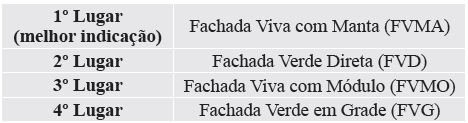 O resultado final indica que o sistema mais adequado a ser utilizado na cidade de Curitiba, sobre a ótica dos decisores participantes deste trabalho, é o sistema de Fachada Viva com Manta (FVMA). Em segundo lugar ficou o Sistema de Fachada Verde Direto (FVD). No terceiro e quarto lugares ficaram, respectivamente, os sistemas de Fachada Viva em Módulo (FVMO) e em Grade (FVG), conforme mostra o Quadro 1.